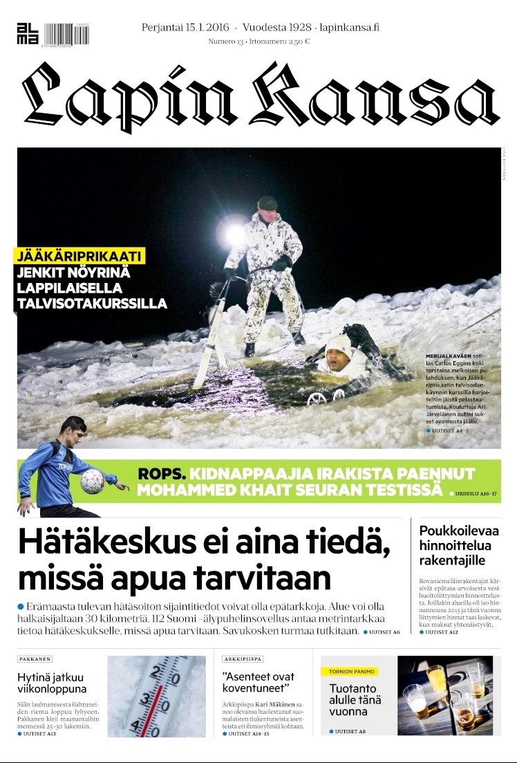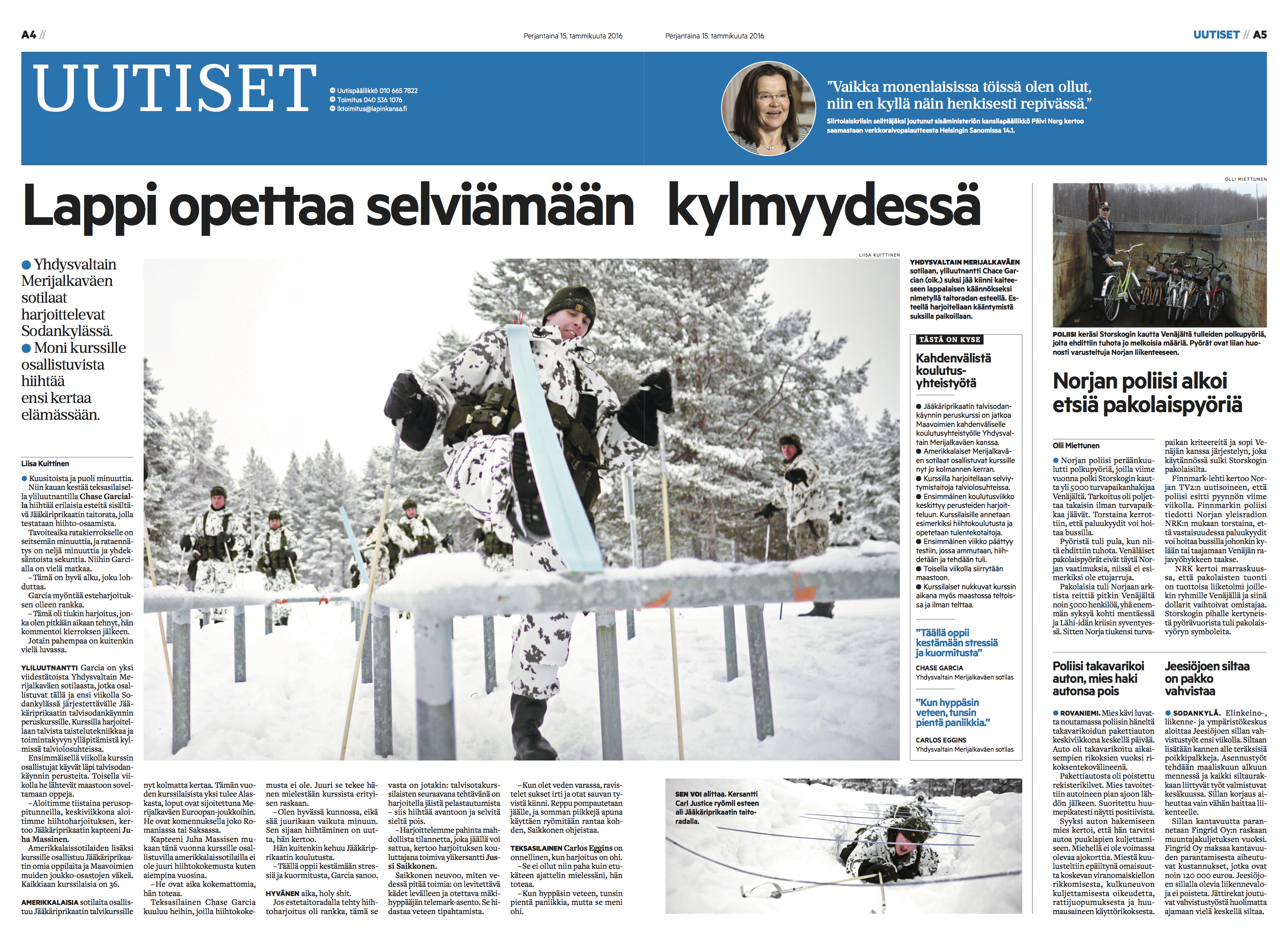 Pääsin seuraamaan Sodankylässä järjestettyä Jääkäriprikaatin talvisodankäynnin peruskurssia, jolle osallistui amerikkalaisia Merijalkaväen sotilaita. Kuvasin heidän koettelemuksiaan pakkasessa. Lapin Kansa 15.1.2016. Teksti ja kuvat: Liisa Kuittinen.