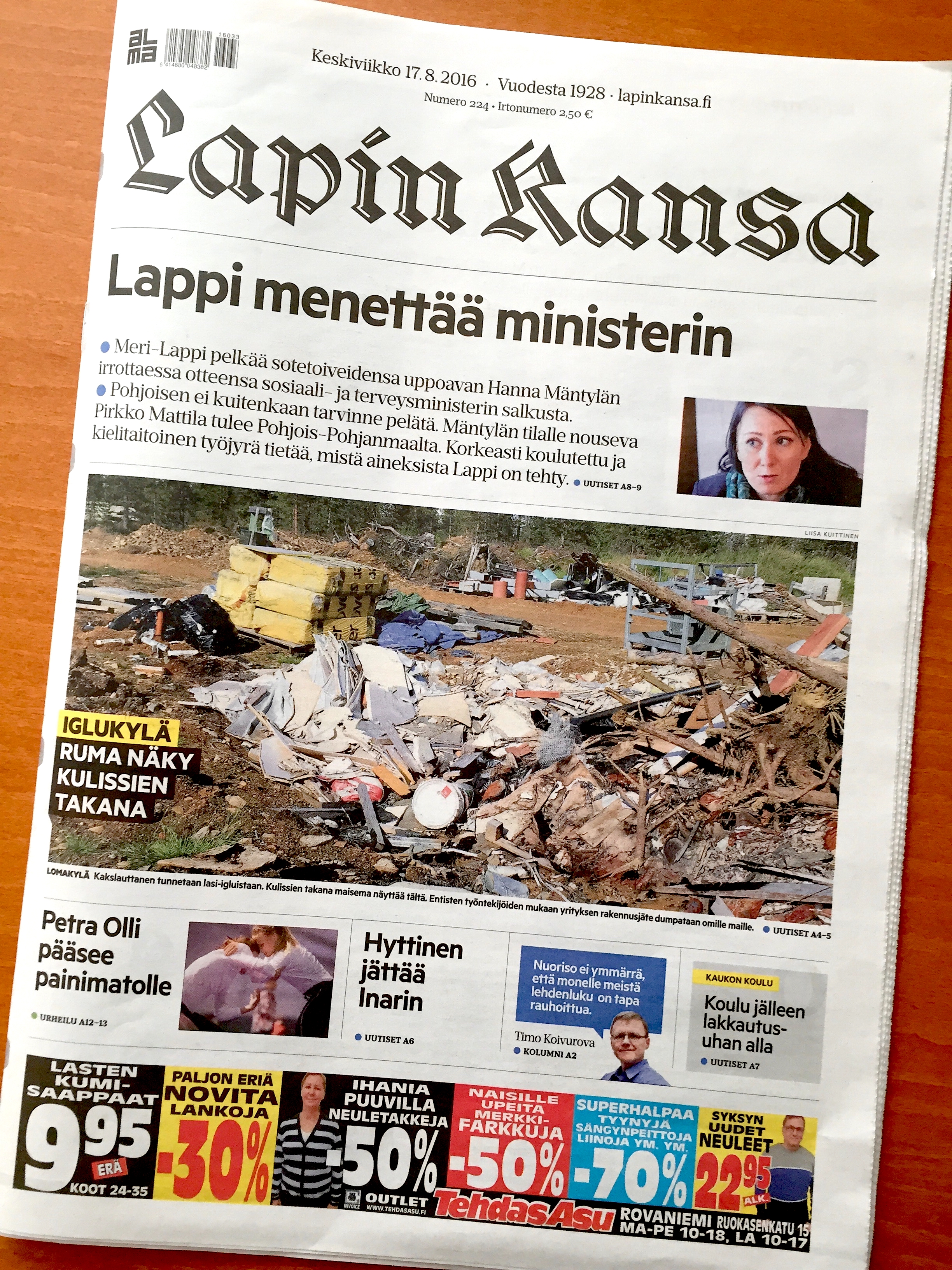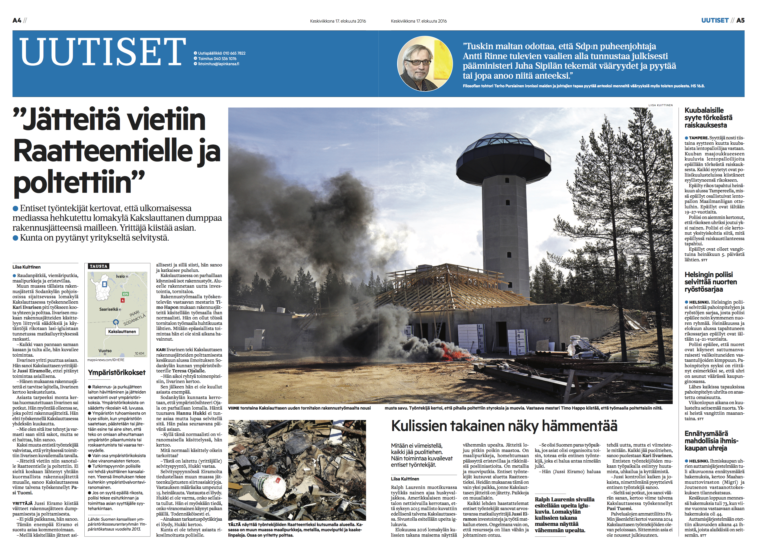 Tein skuupin lomakylä Kakslauttasen ympäristörikosepäilyistä. Jutun perusteella poliisi aloitti lomakylässä rikostutkinnan. Lomakylän yrittäjä myönsi myöhemmin jätteiden polton. Lapin Kansa 14.8.2016. Teksti ja kuvat: Liisa Kuittinen.
