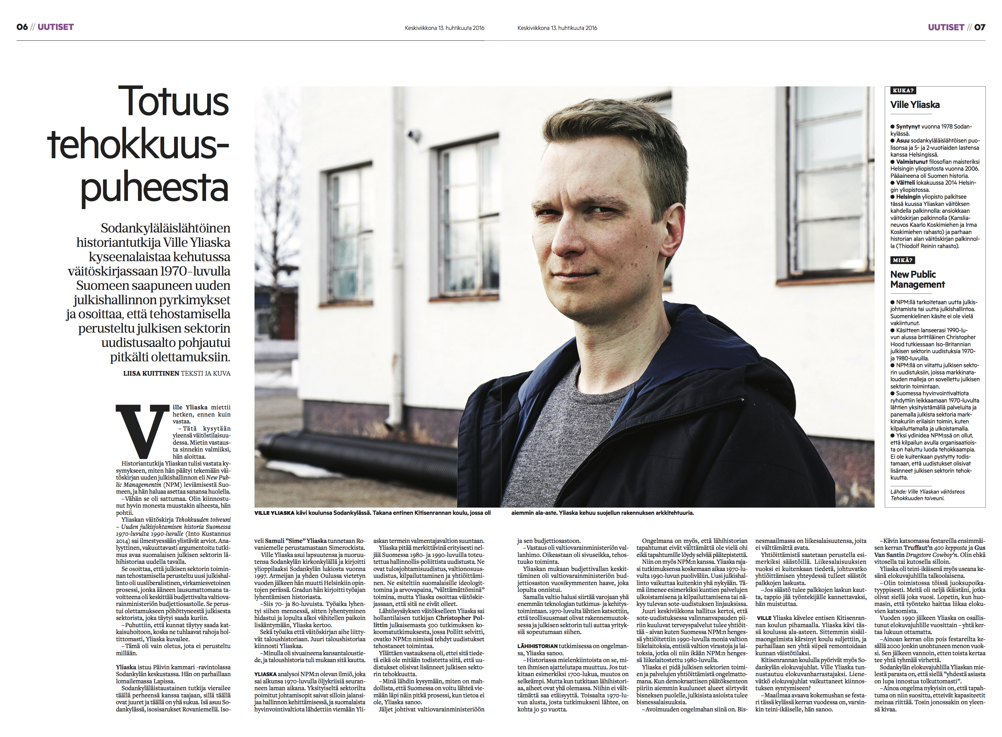 Tein Lapin Kansaan netissä hyvin klikatun jutun sodankyläläislähtöisestä historiantutkijasta Ville Yliaskasta, joka kertoi julkishallinnon tehostamista käsittelevästä väitöskirjastaan. Lapin Kansa 13.4.2016. Teksti ja kuva: Liisa Kuittinen.