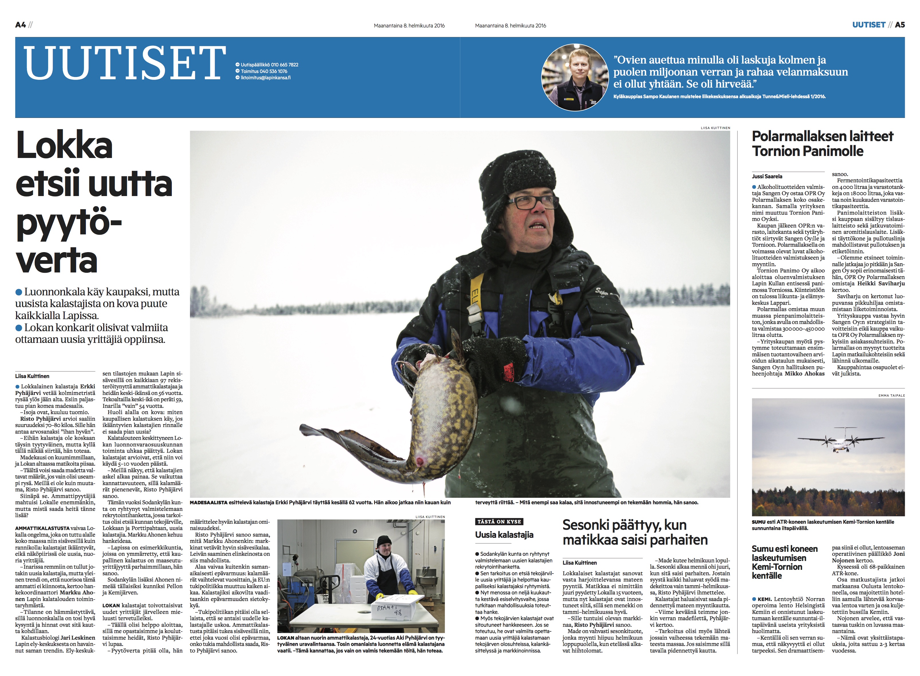 Kävin Lokassa tapaamassa ammattikalastajia, jotka kertoivat alueen kalastajapulasta ja uusien kalastajien rekrytoinnista Sodankylän tekojärville. Lapin Kansa 8.2.2016. Teksti ja kuvat: Liisa Kuittinen.